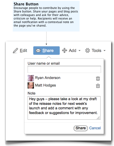 Verschicken Sie einen Link per Email oder benutzen sie die “Teilen”.-Funktion von Confluence. Die angesprochene Person kann sich dann einfach im Wiki einloggen und Inhalte verändern oder kommentieren.